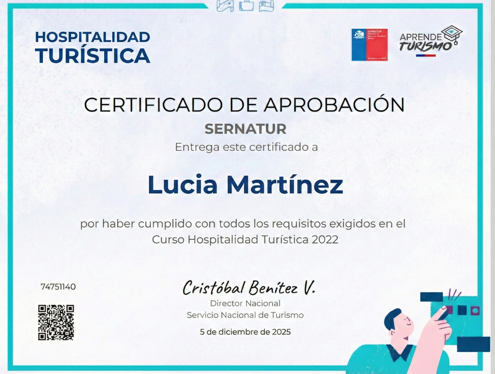 Al completar todos los módulos y aprobar los controles, se genera un certificado de finalización que puedes descargar desde la plataforma Aprende Turismo.